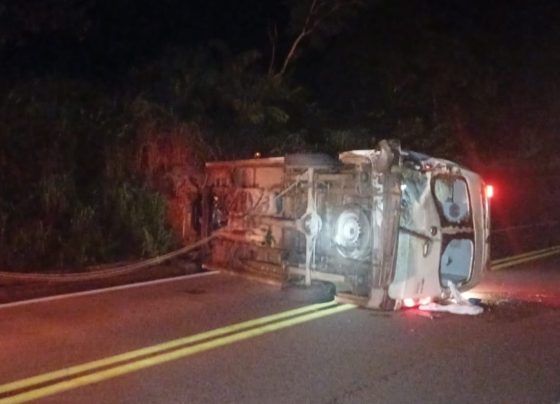 Ambulância com paciente e equipe médica tomba e deixa cinco feridos na BR-174