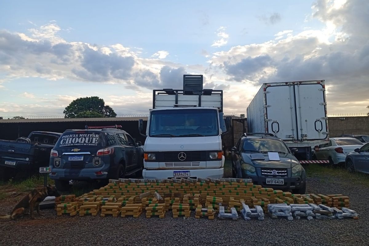 Foi utilizado o apoio do cão de faro “Zeus”, do Batalhão de Choque, que localizou dentro de uma pasta, um tablete de substância análoga à maconha, e na carroceria do caminhão.