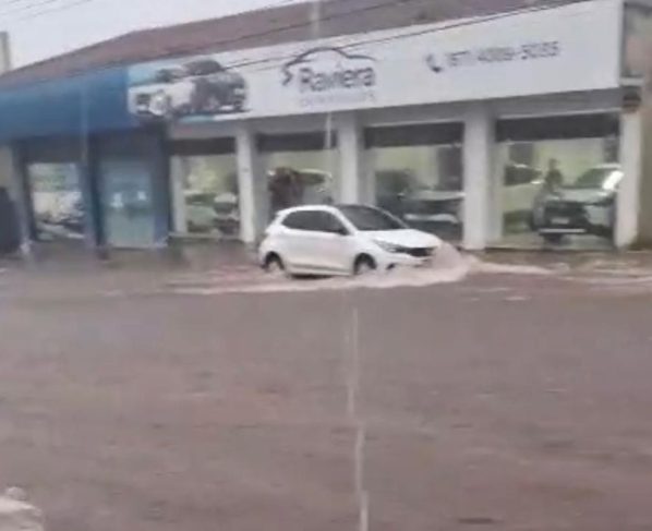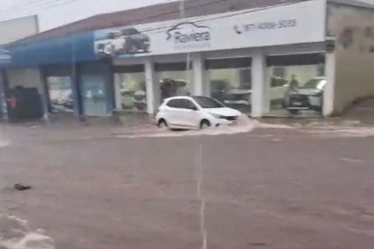 Em vídeo enviado à reportagem, um comerciante mostra a Avenida Calógeras, uma das mais movimentadas na região central da cidade, tomada pela água.
